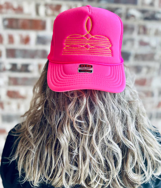 -Neon Pink Foam Trucker Hat with Yellow embroidered thread
