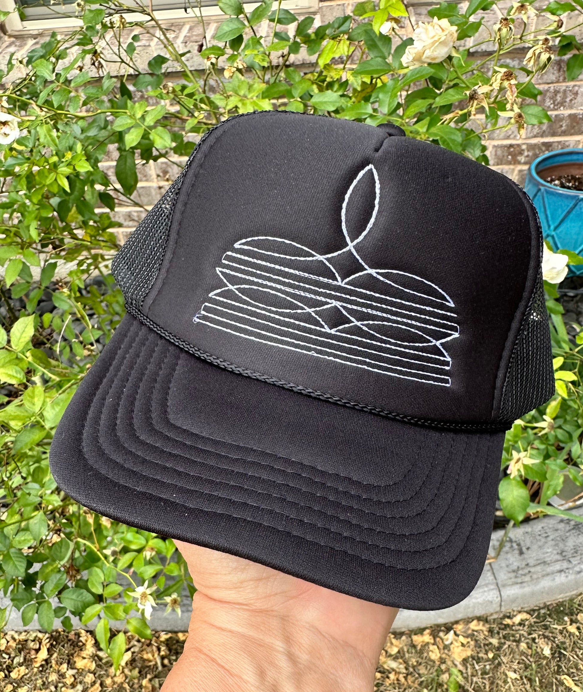 Embody a touch of western charm with our White Booth Stitch Embroidered Black Trucker Hat. The carefully crafted stitching adds a touch of artistry to this classic hat, perfect for elevating any outfit.